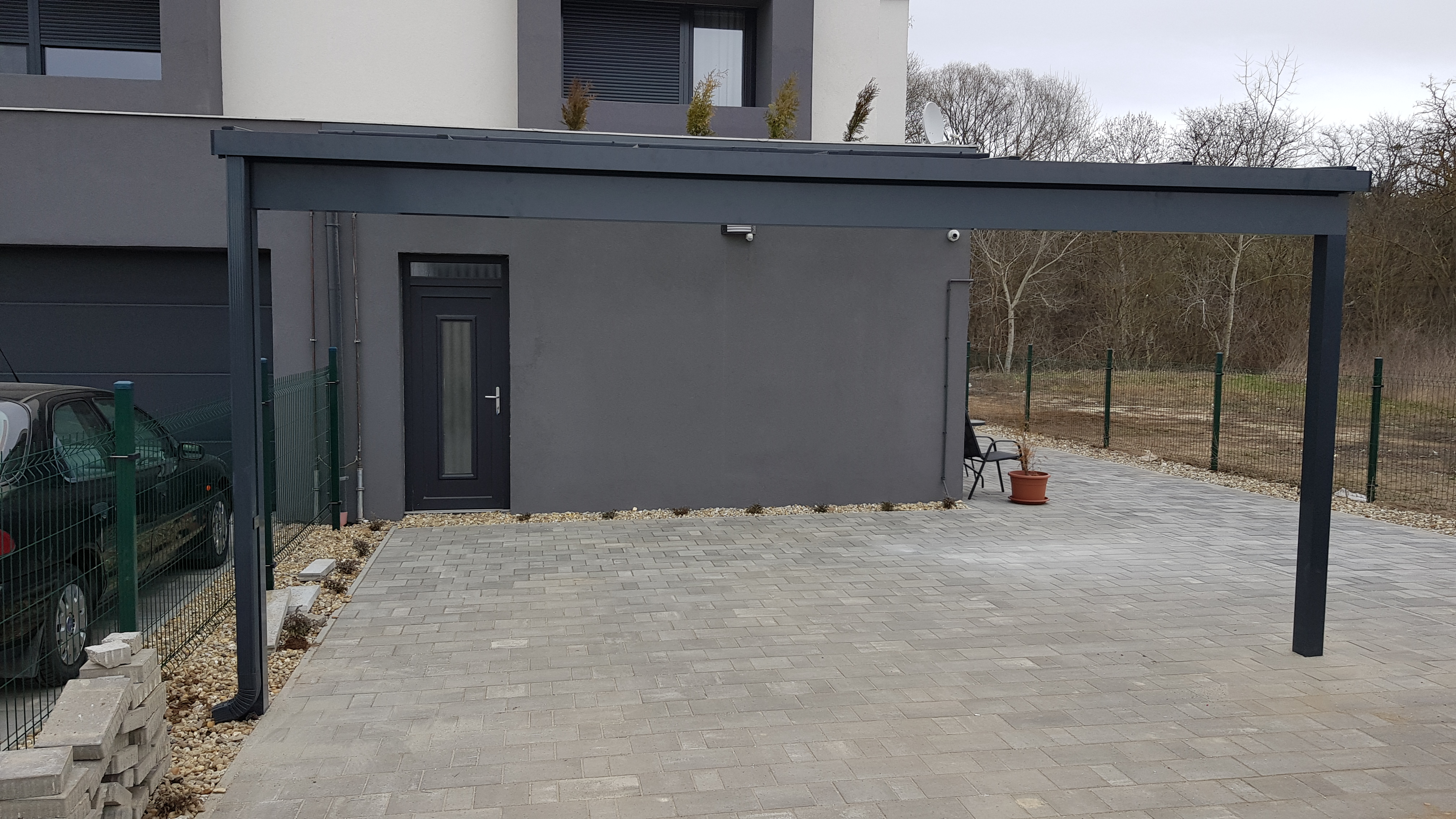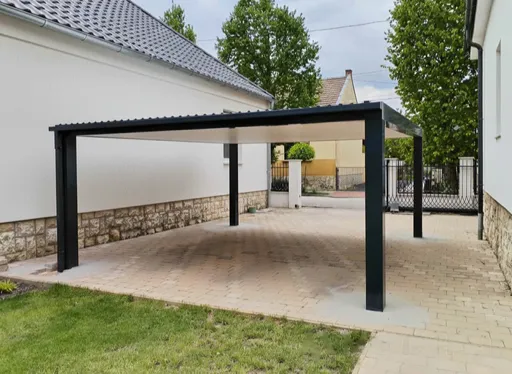 Az árnyékolóval ellátott autóbeálló letisztult megjelenése illeszkedik bármilyen homlokzathoz, miközben hatékonyan védi az outót.